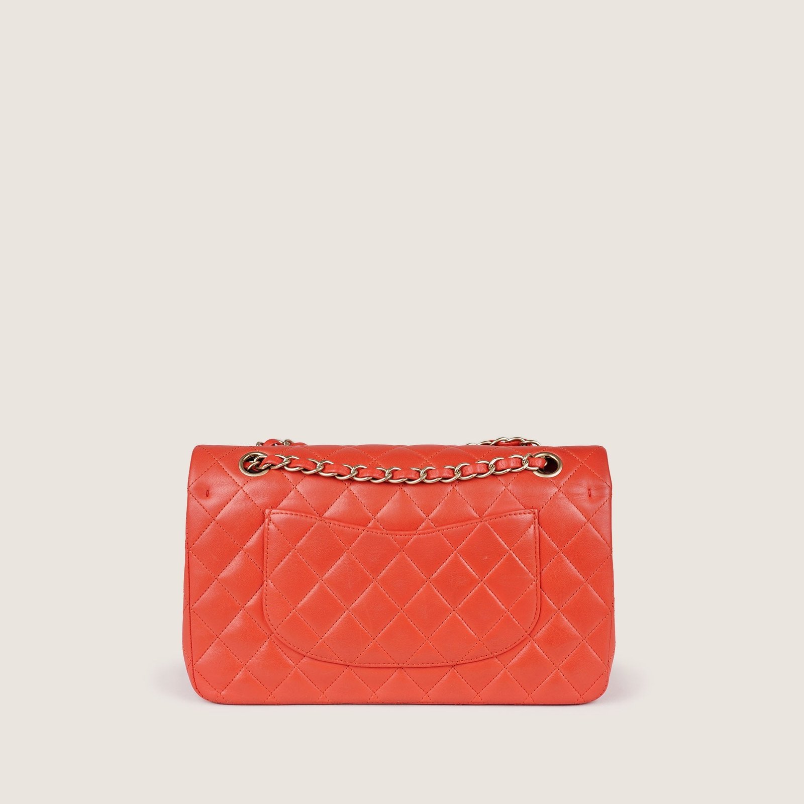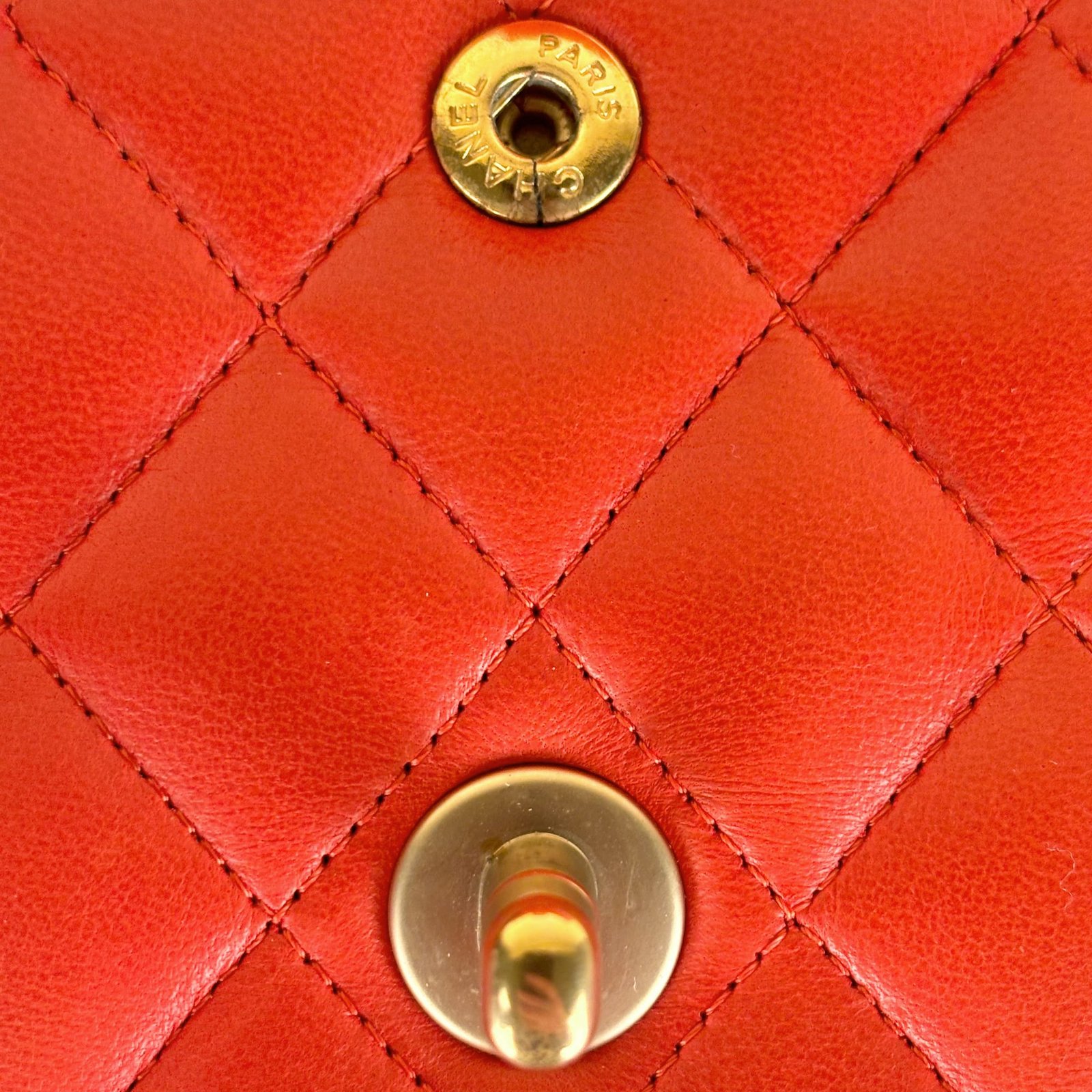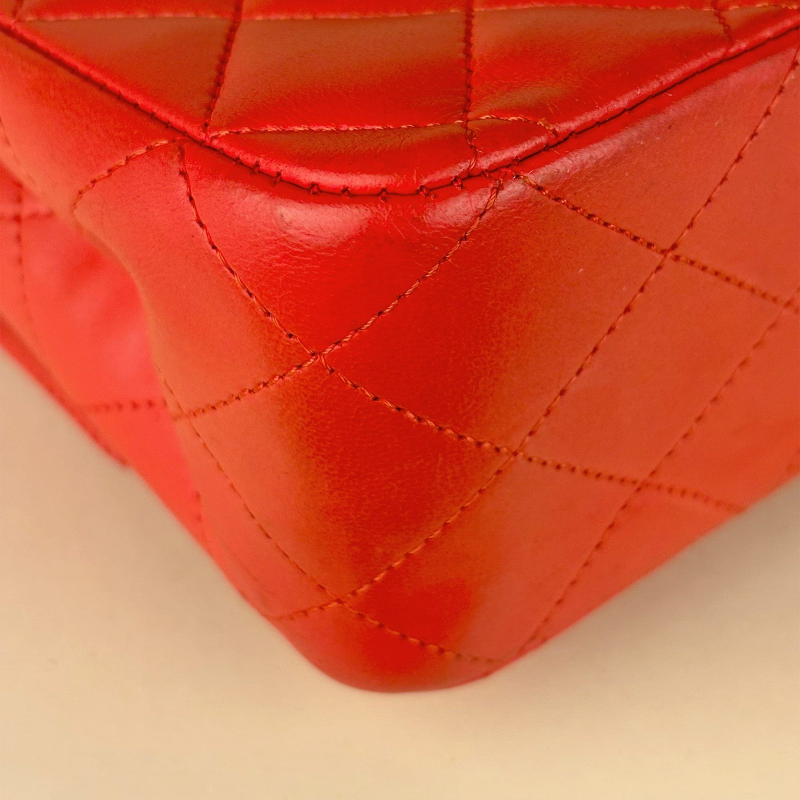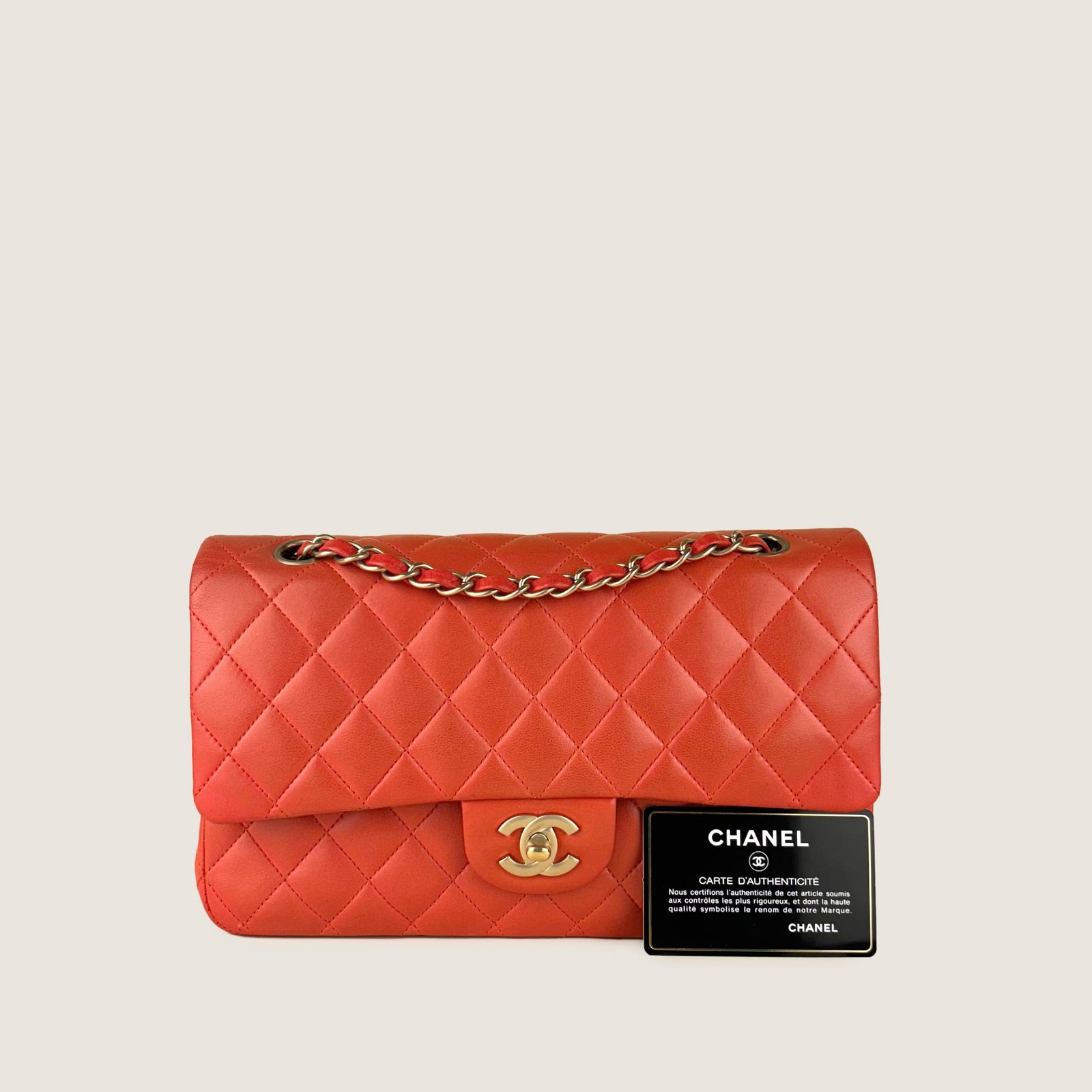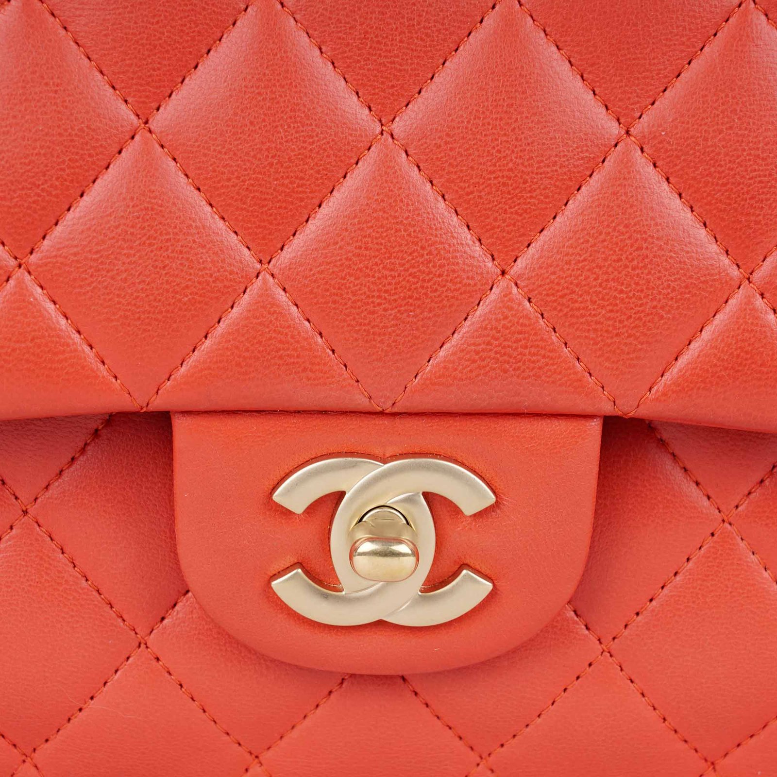 Introducing the Classic Medium Double Flap Bag from Chanel. With a stunning color combination of Orange diamond quilted lambskin and matte gold hardware, this bag is perfect for all occasions. Its spacious leather interior fits your daily essentials, while the elegant gold-colored hardware and CC twist lock add a touch of luxury. Versatile and stylish, don’t miss out on this must-have accessory!