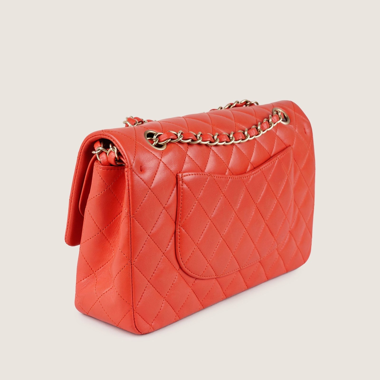 This is an authentic Chanel Classic Medium Double Flap Bag in Orange Lambskin.