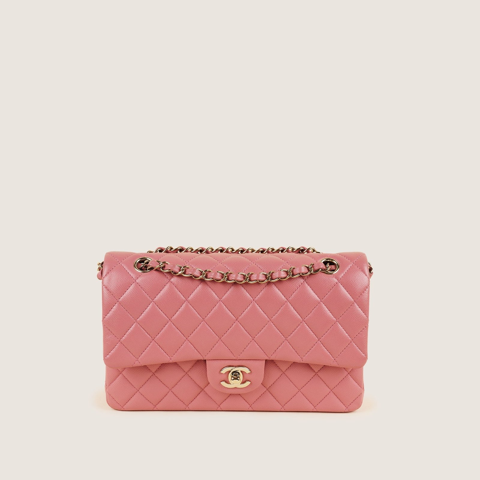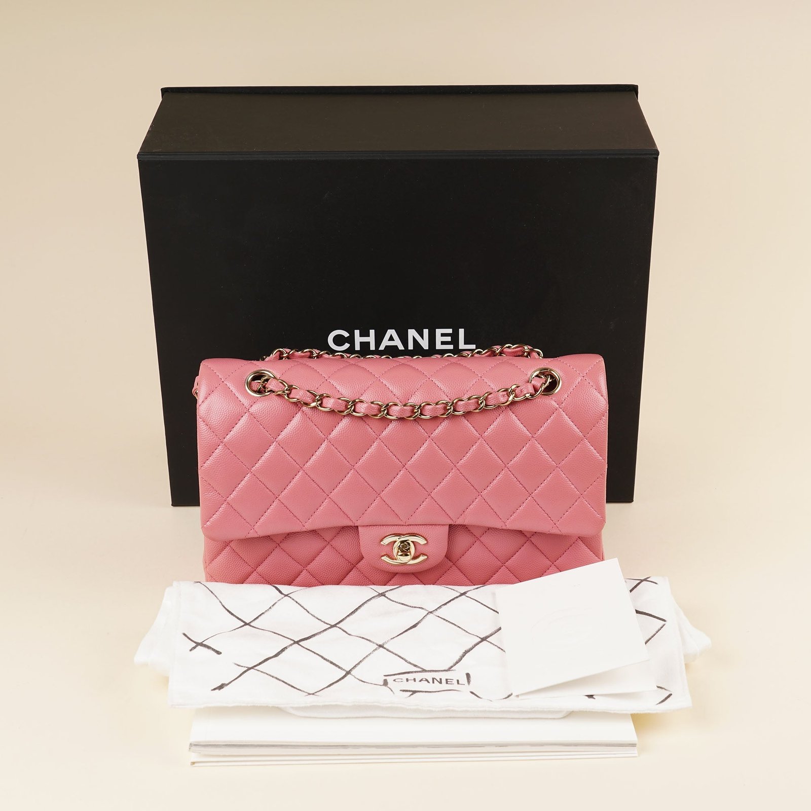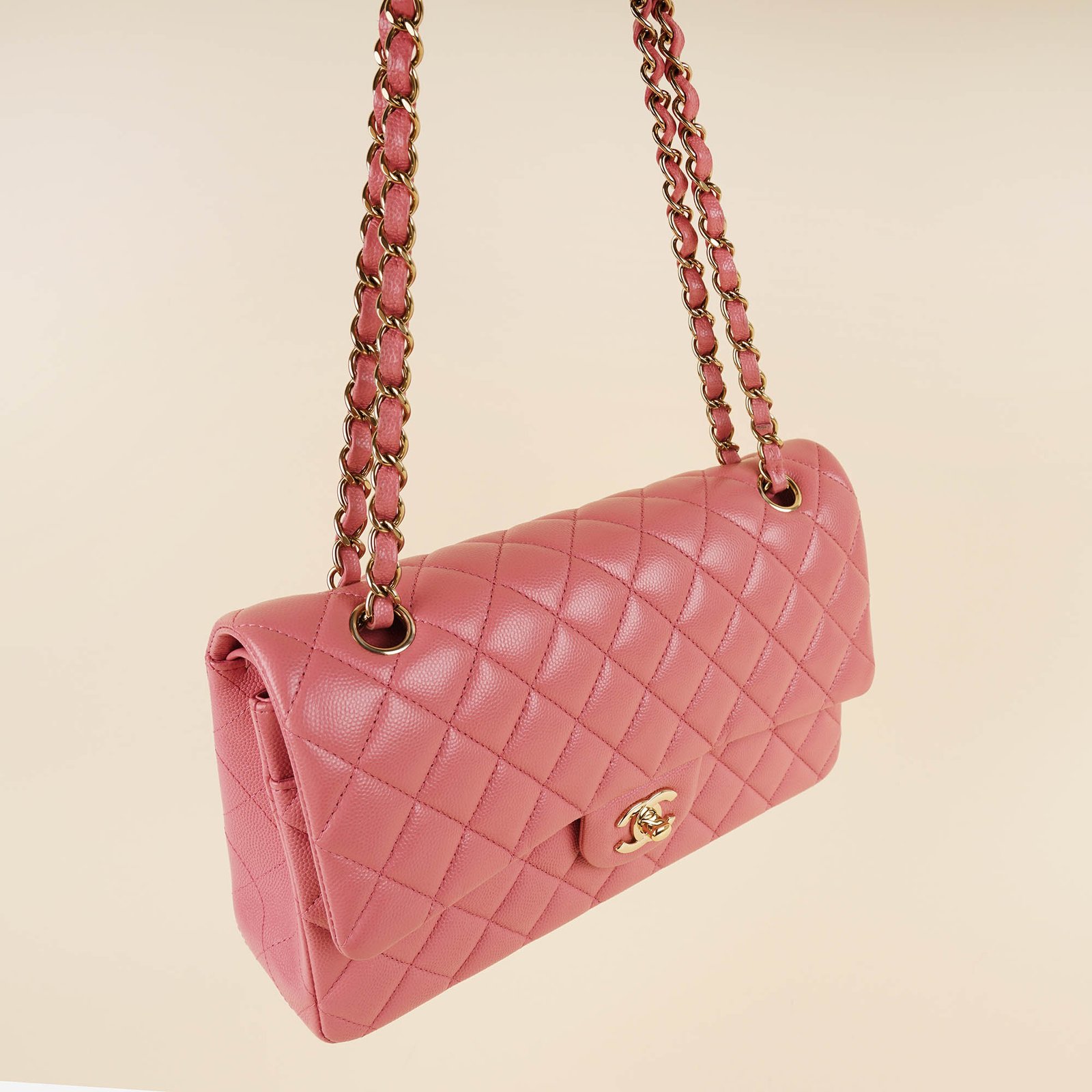 If you are looking?to fall in love at first sight then just keep your eyes close at this stunning beauty from Chanel!?This lovely bag is one of the worlds most sought after and it¡¯s easy to understand why. The?combination of the amazing coral pink?color, the diamond quilted caviar leather and gold-colored hardware is less common to find so you better hurry up and don’t miss out on this magnificent bag!