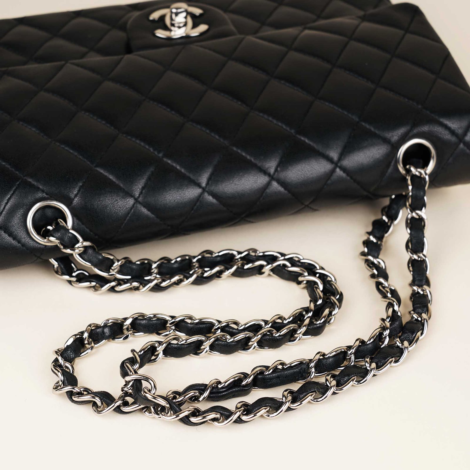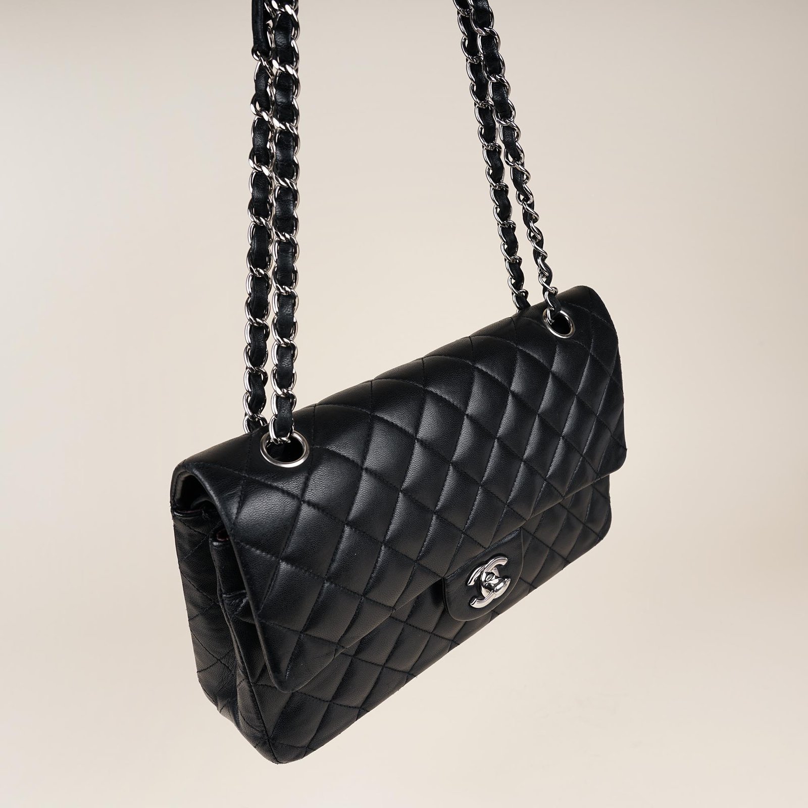 Introducing the Classic Medium Double Flap Bag from Chanel. This must-have with a stunning color combination of black diamond quilted lambskin and silver-colored hardware is perfect for all occasions. Its spacious leather interior fits your daily essentials, while the elegant silver-metal hardware and CC twist lock add a touch of luxury. Versatile and stylish, don’t miss out on this must-have accessory from Chanel.?Don’t miss out!