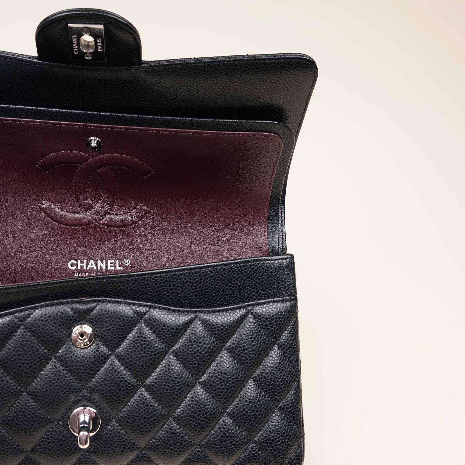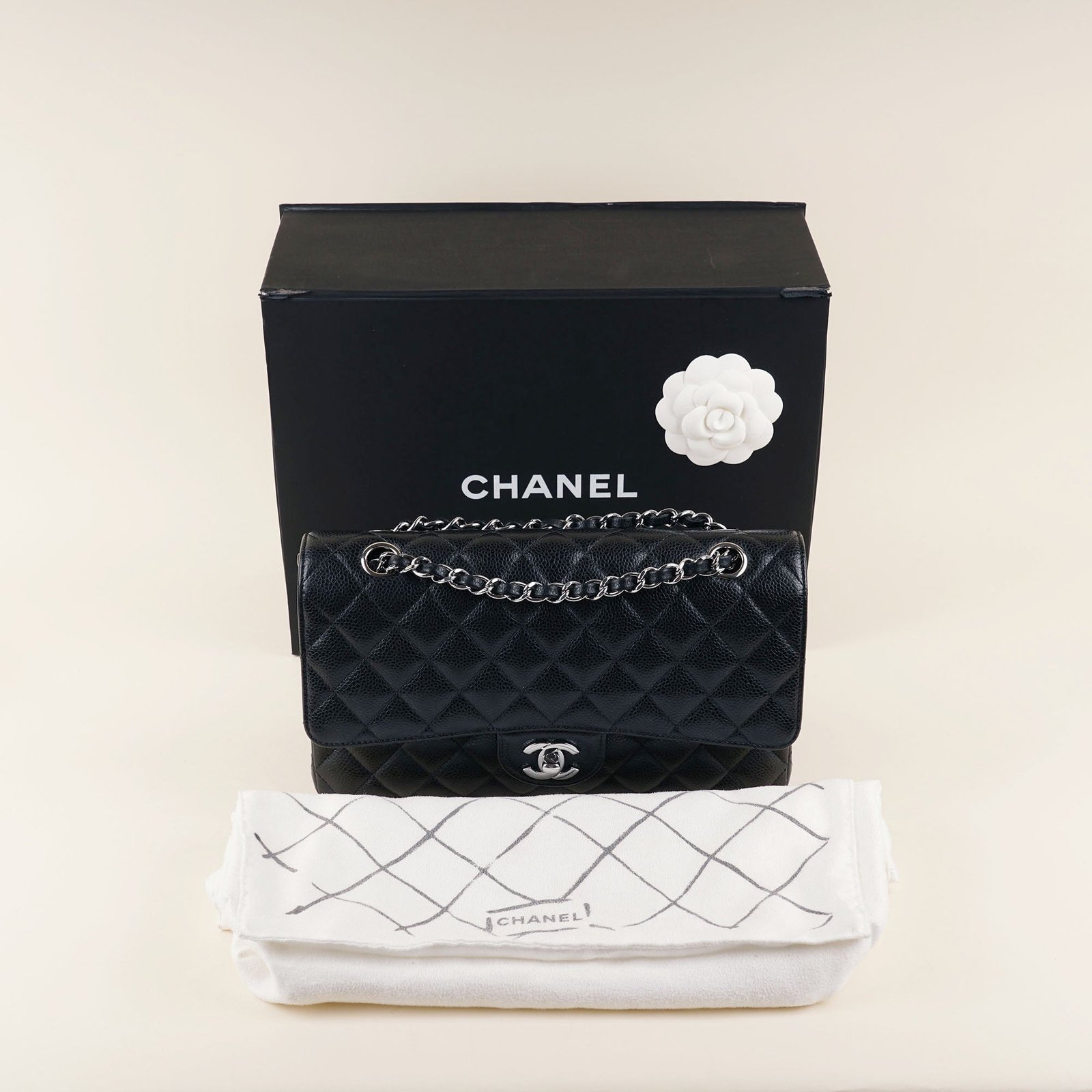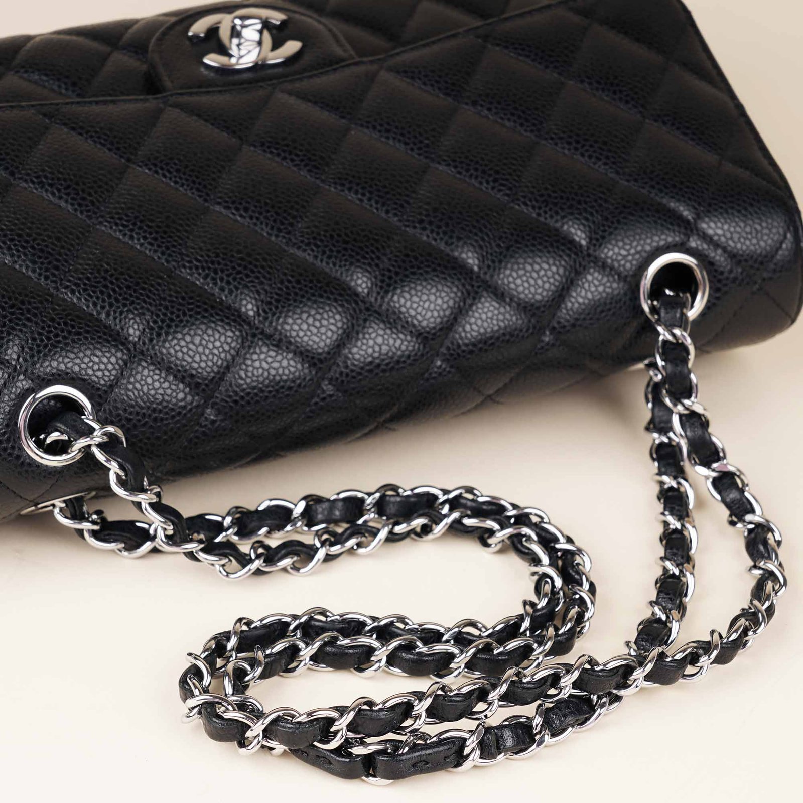 This lovely bag is probably?one of the worlds most sought after but why is that? First of all it’s a classic Chanel flap bag. But secondly and above all, it’s the combination of the black color, the diamond quilted caviar leather and silver-colored hardware. This combinations is less common to find so you better hurry up and?don’t miss out on this magnificent bag!
