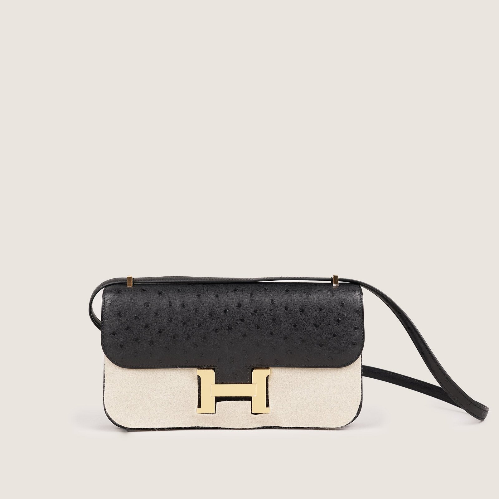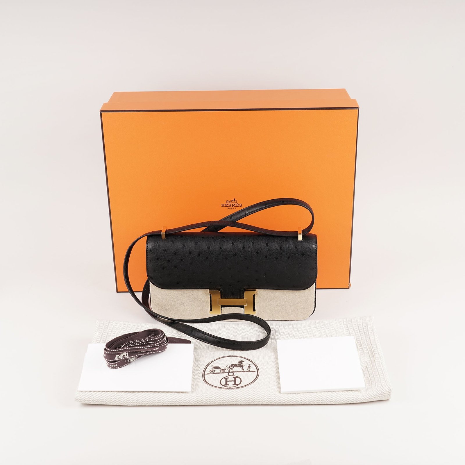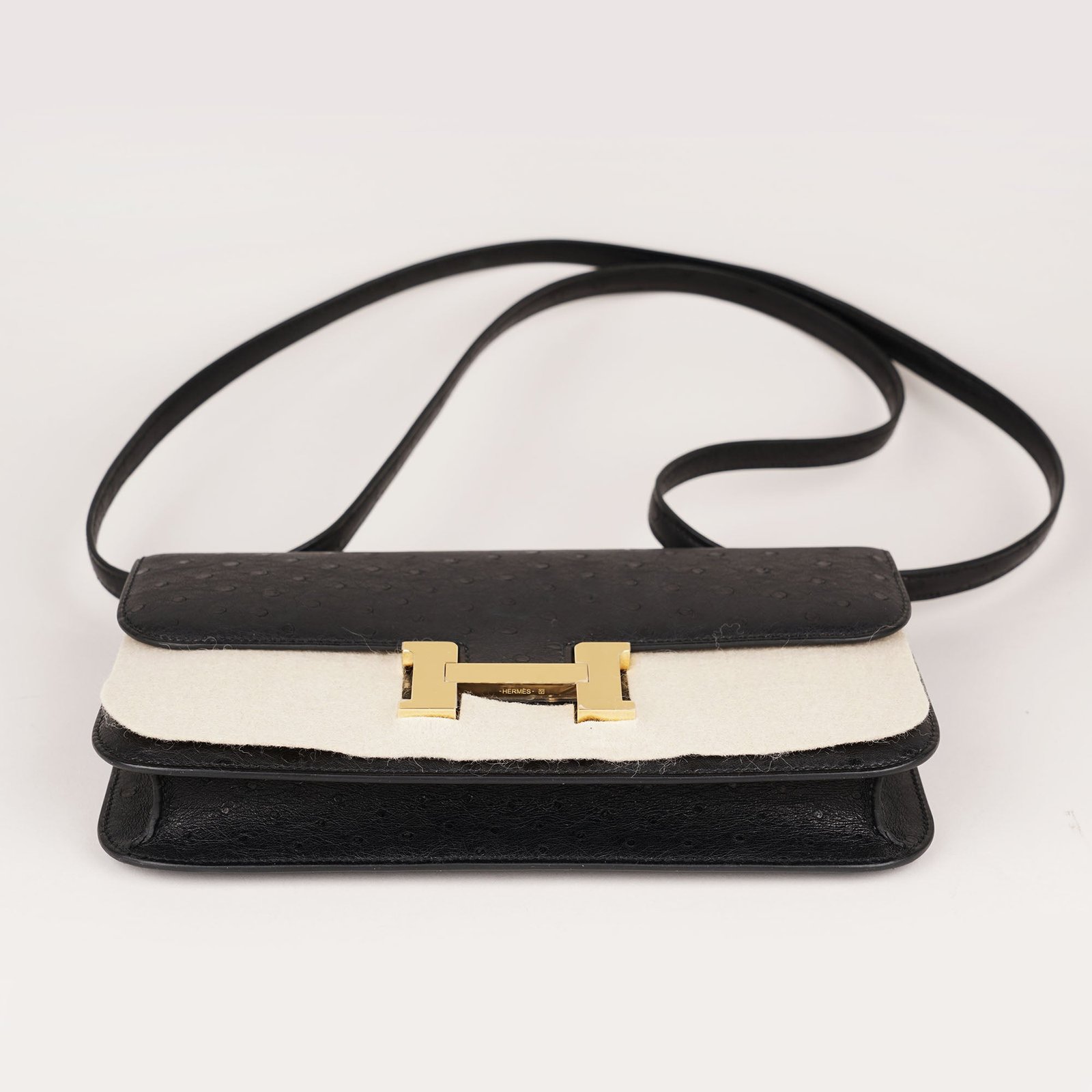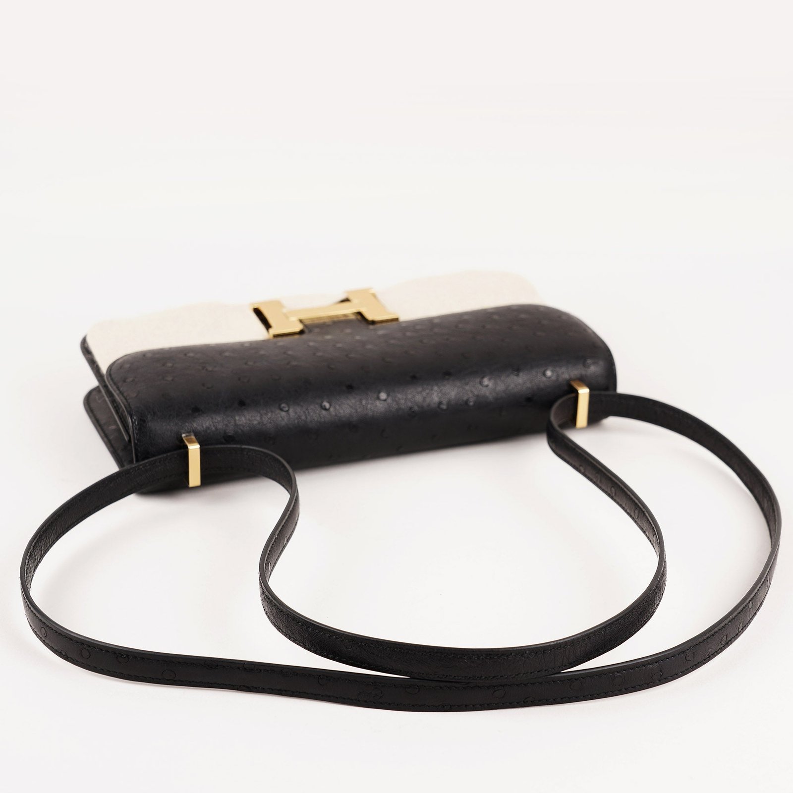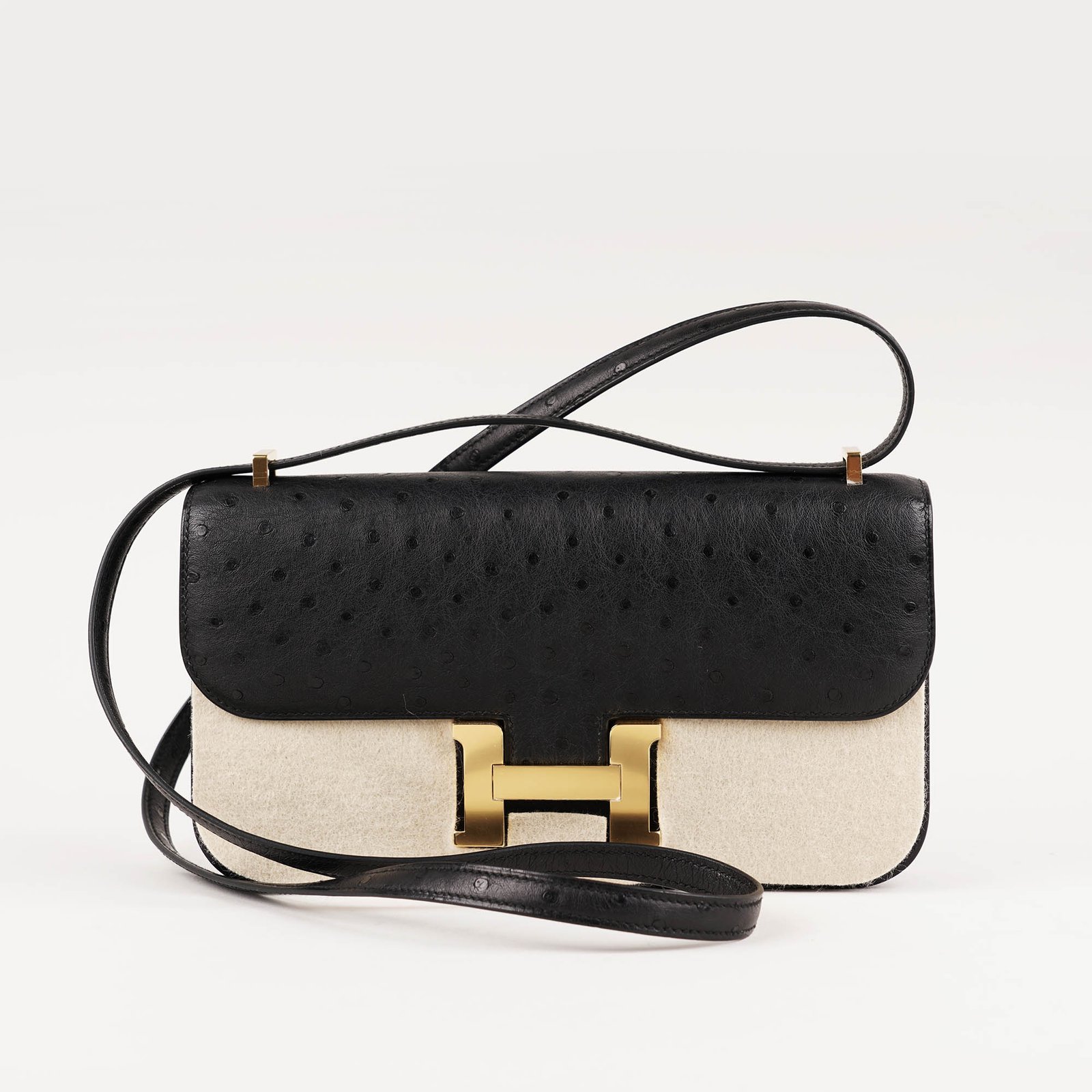 Introducing the Constance Elan Shoulder Bag, a stylish and versatile addition to your wardrobe. Made with premium black ostrich leather and adorned with gold-plated hardware, including an iconic H buckle, this bag exudes luxury. With a partitioned interior and multiple pockets, it’s perfect for organizing your essentials in style. Invest in quality. Don’t miss out!