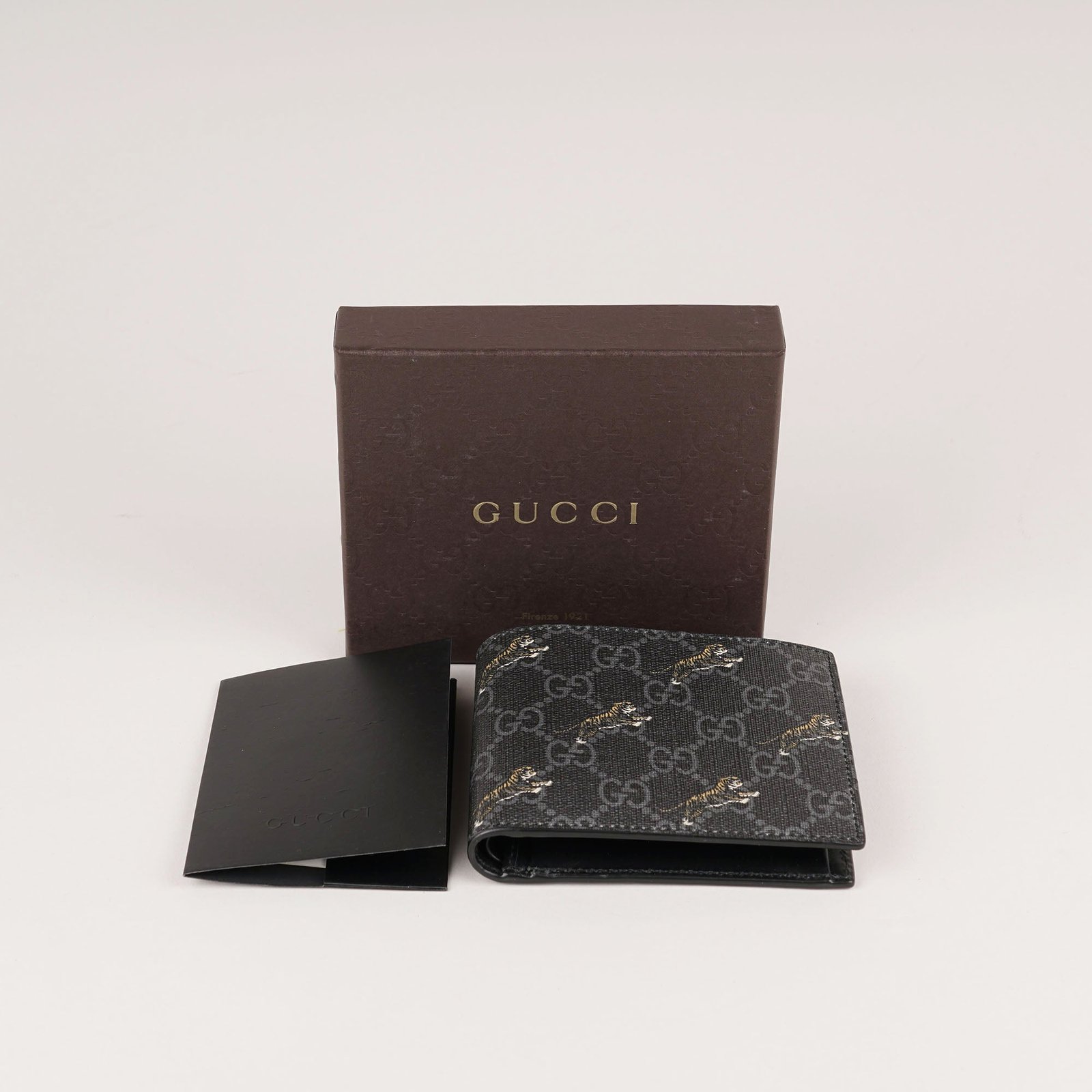 This wallet is made with Gucci¡¯s supreme canvas with jumping Tigers and a leather interior. The wallet has 8 card slots, and two separate bill compartments. This is a truly unique piece for the Gucci lover. Don¡¯t miss out!