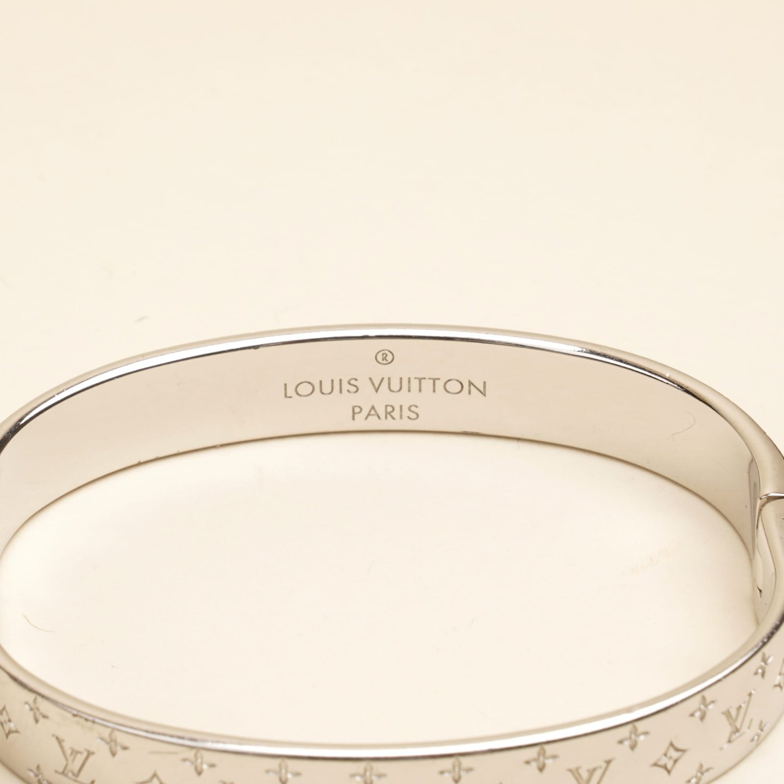 This is an authentic Louis Vuitton Nanogram Cuff Bracelet in Silver-Finish Metal.