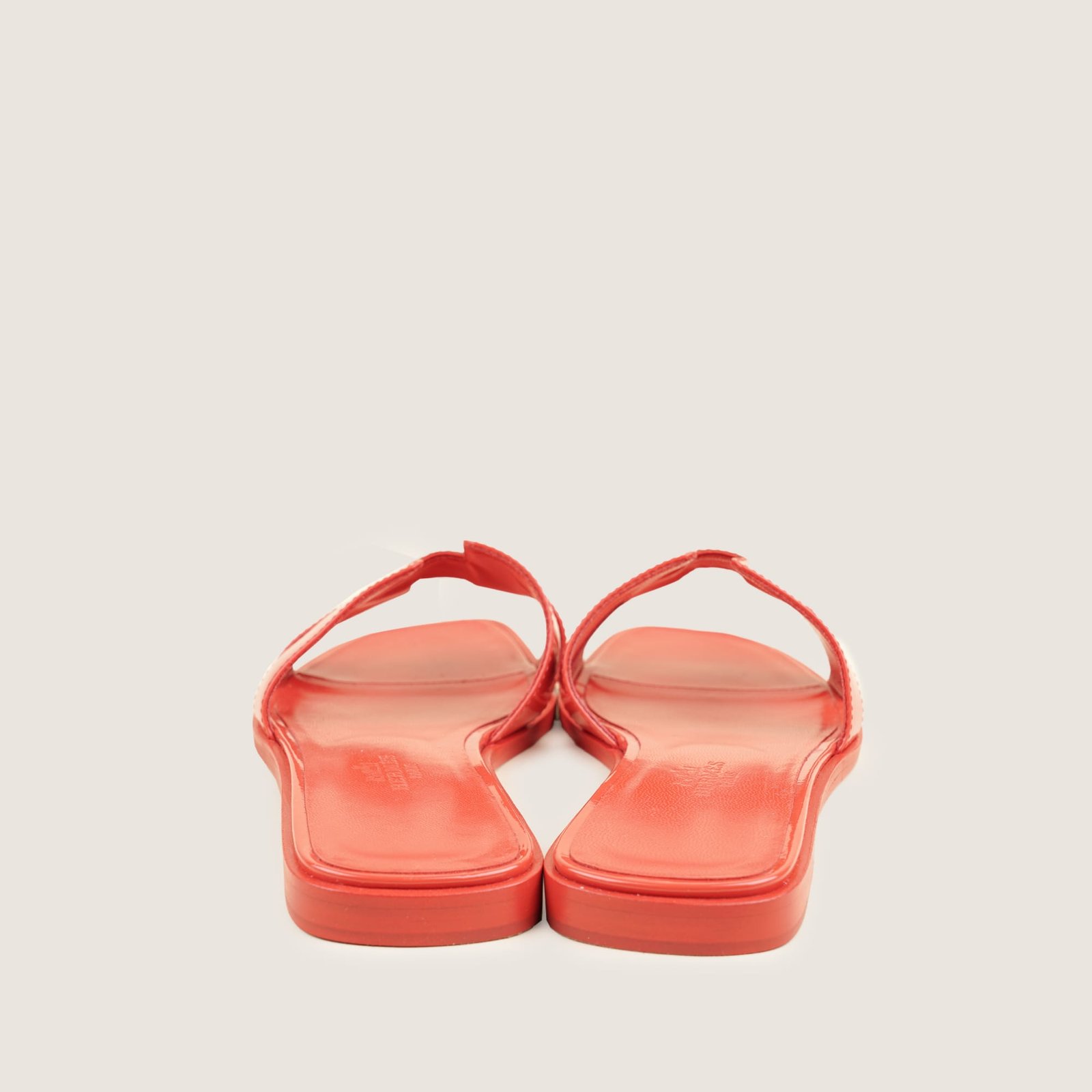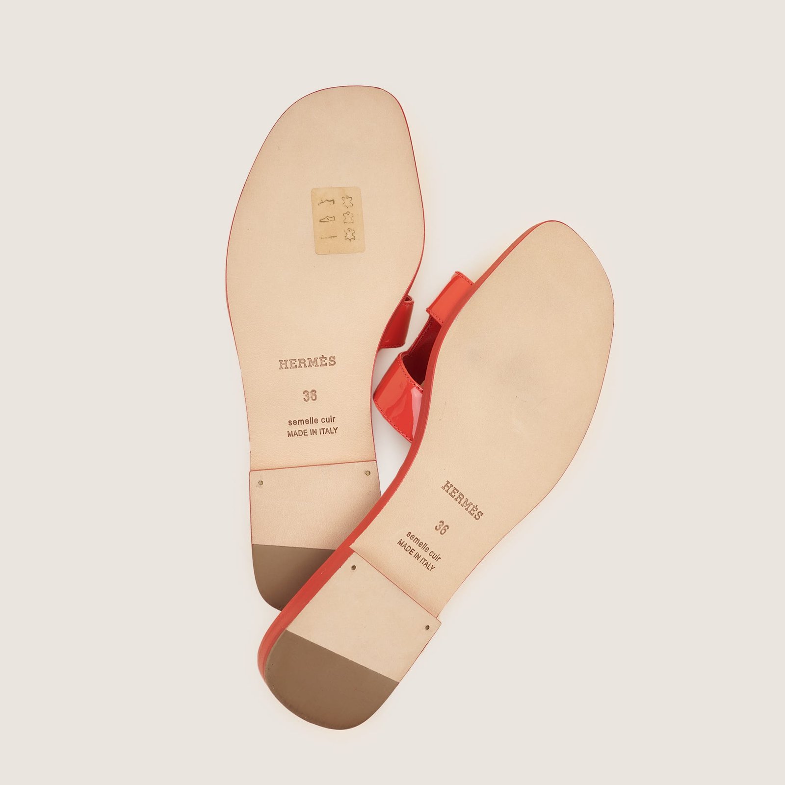 This is a pair of authentic Herm¨¨s Oran Sandals in Coral Patent Leather, size 36.