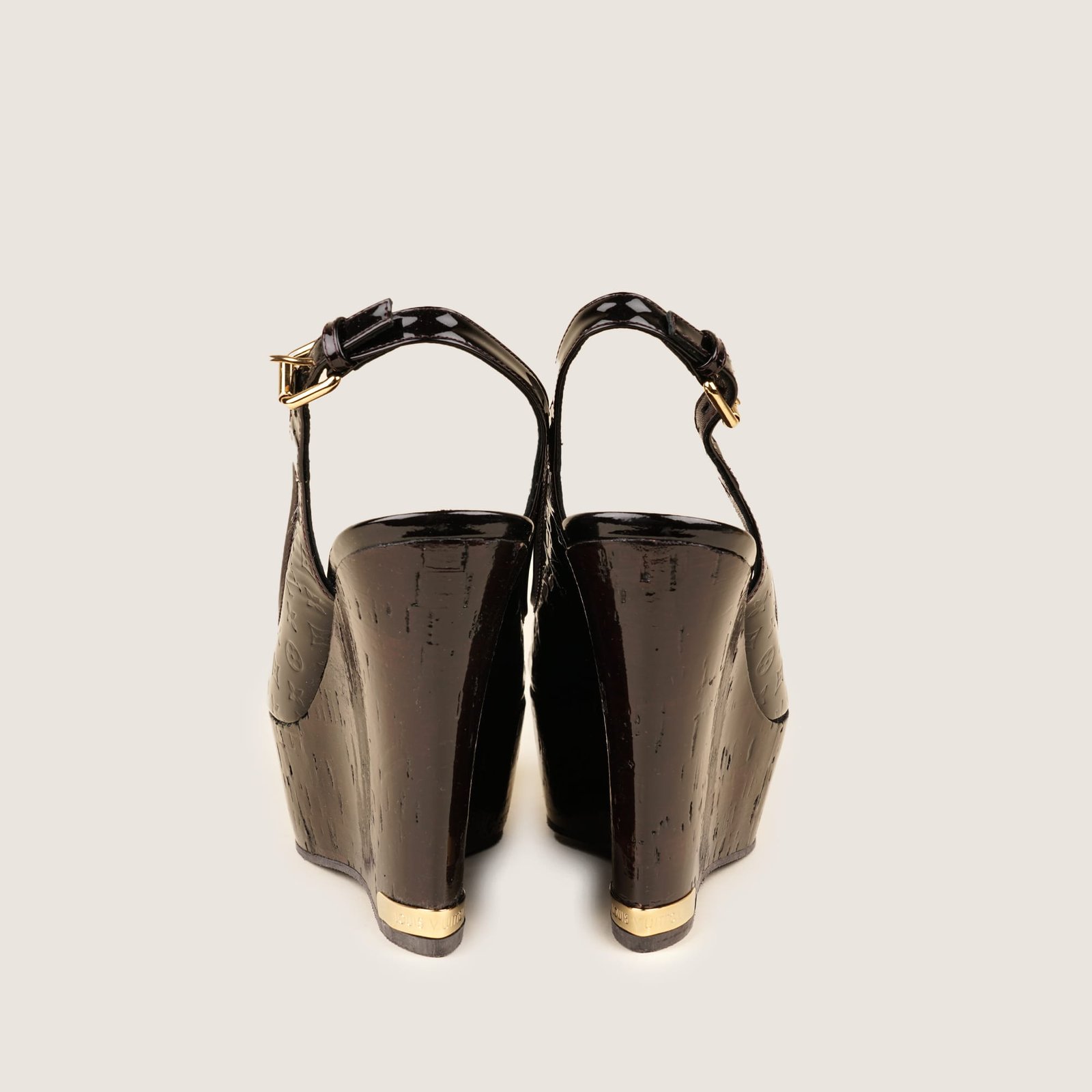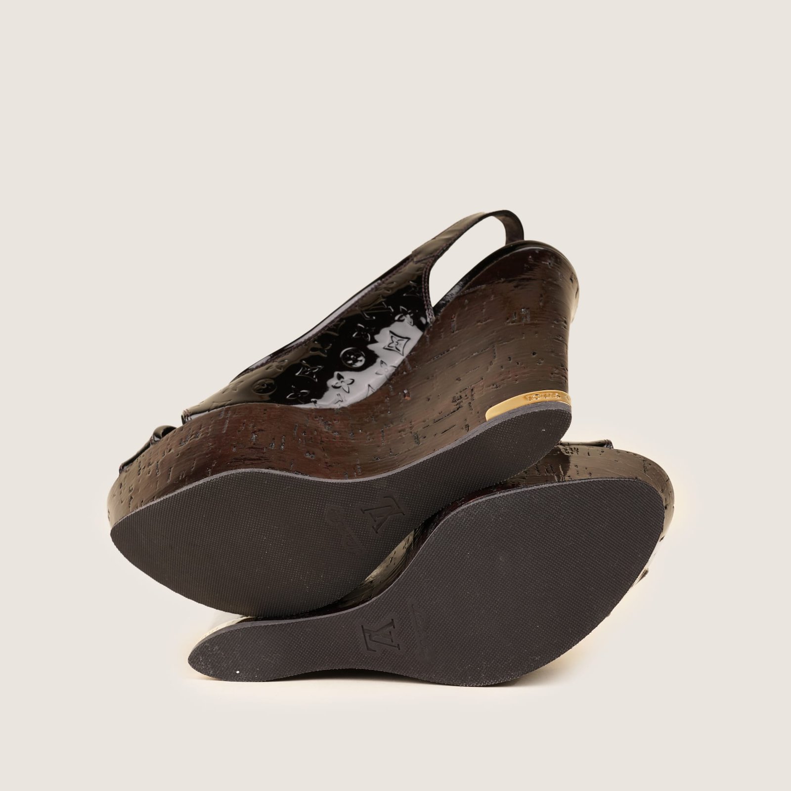 This is a pair of authentic Louis Vuitton Pantheon Wedges in Amarante Monogram Vernis Leather, size 36.