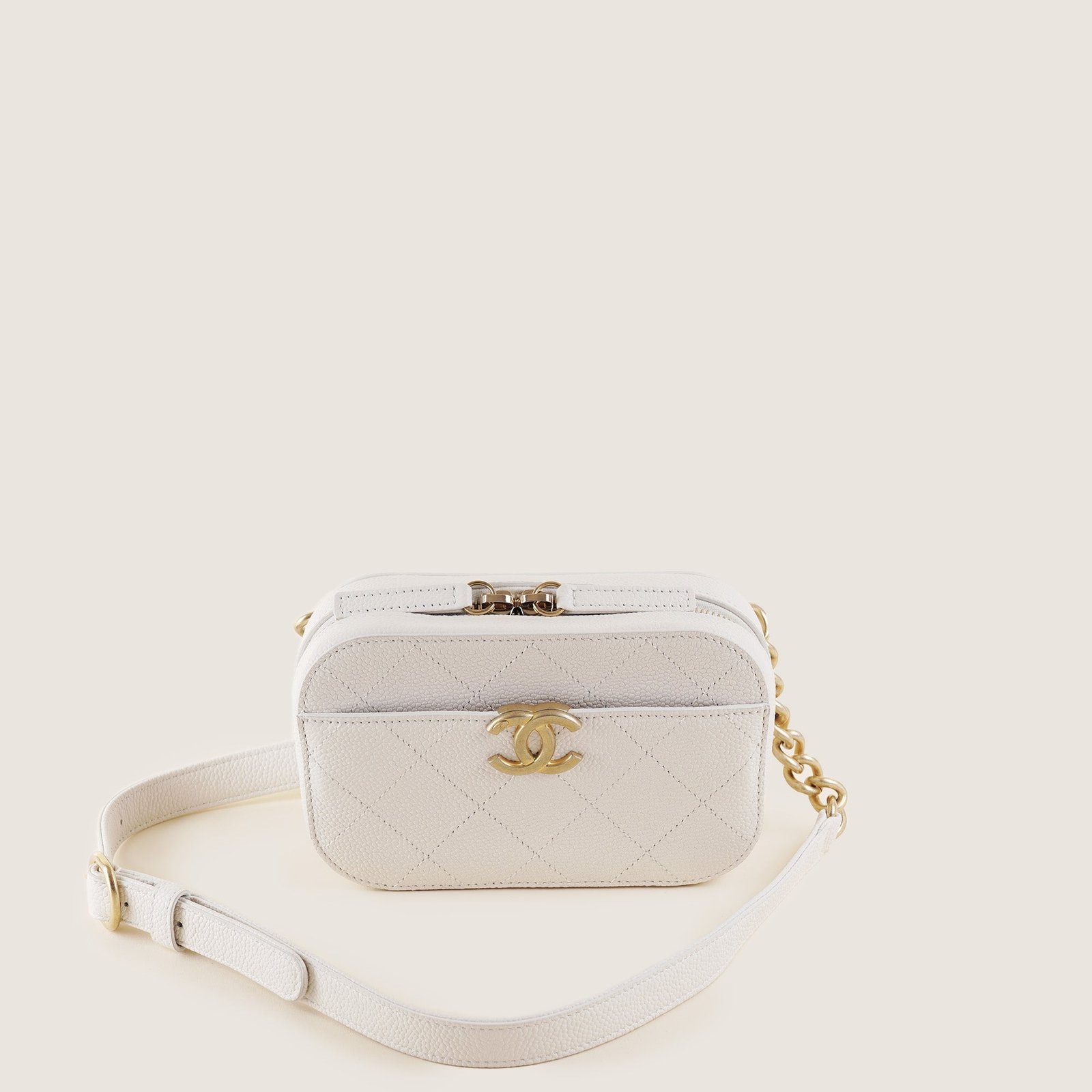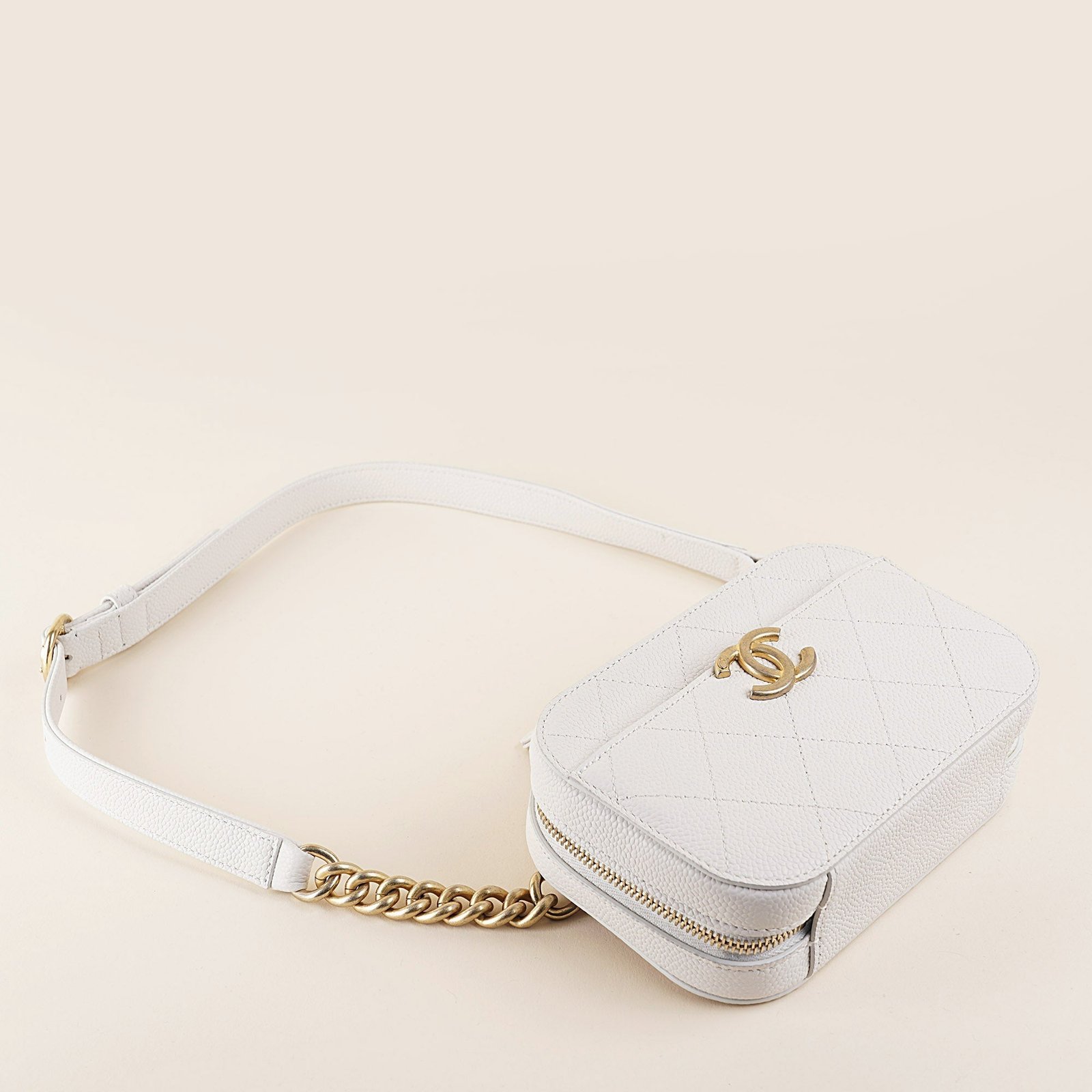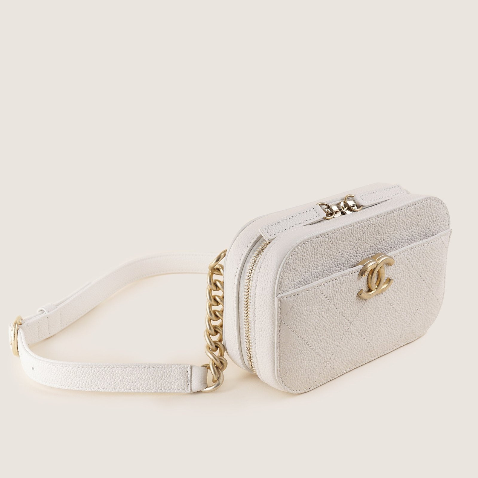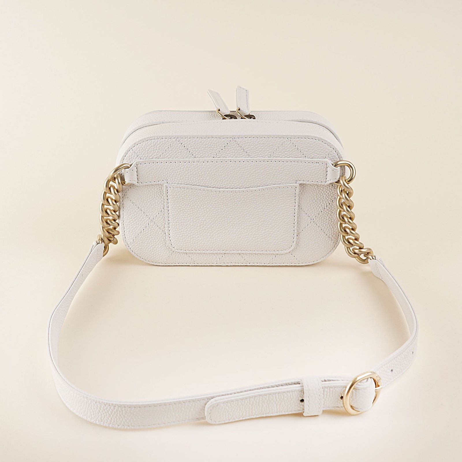 This is an authentic?Chanel Rectangular Bum Bag in White Diamond Quilted Caviar Leather.