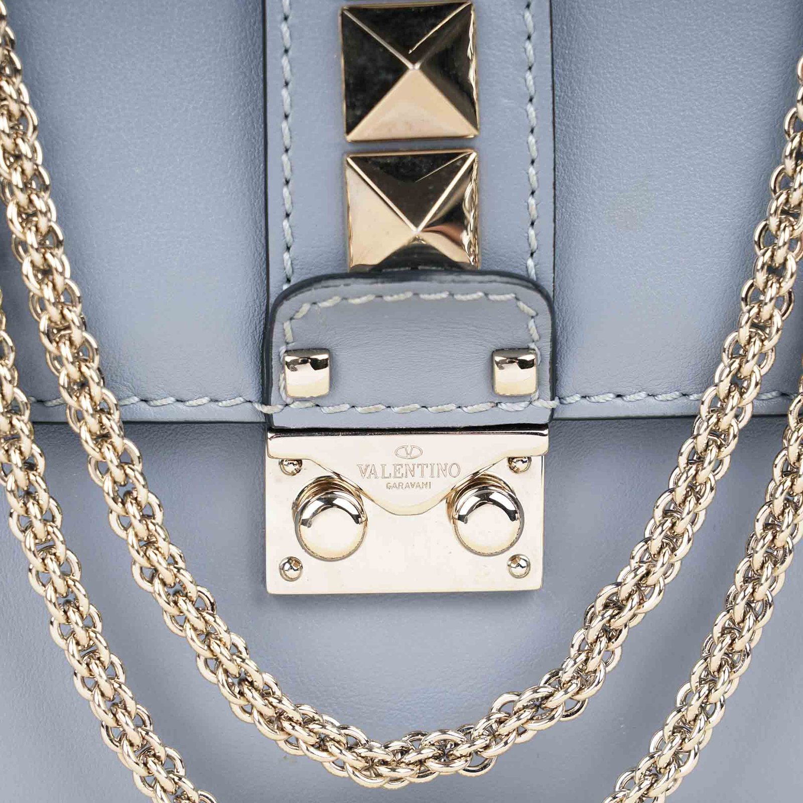 The Small Glam Lock from Valentino is a chic and sophisticated shoulder bag made from amazing baby blue leather. Its gold-toned bijoux chain shoulder strap adds a touch of elegance, while the pyramid-shaped studs on the front flap make a bold statement. Complete with a secure gold press lock and spacious interior. The versatile chain allows the bag to be used in multiple ways such as a shoulder bag, crossbody bag and a clutch. Don’t miss out!