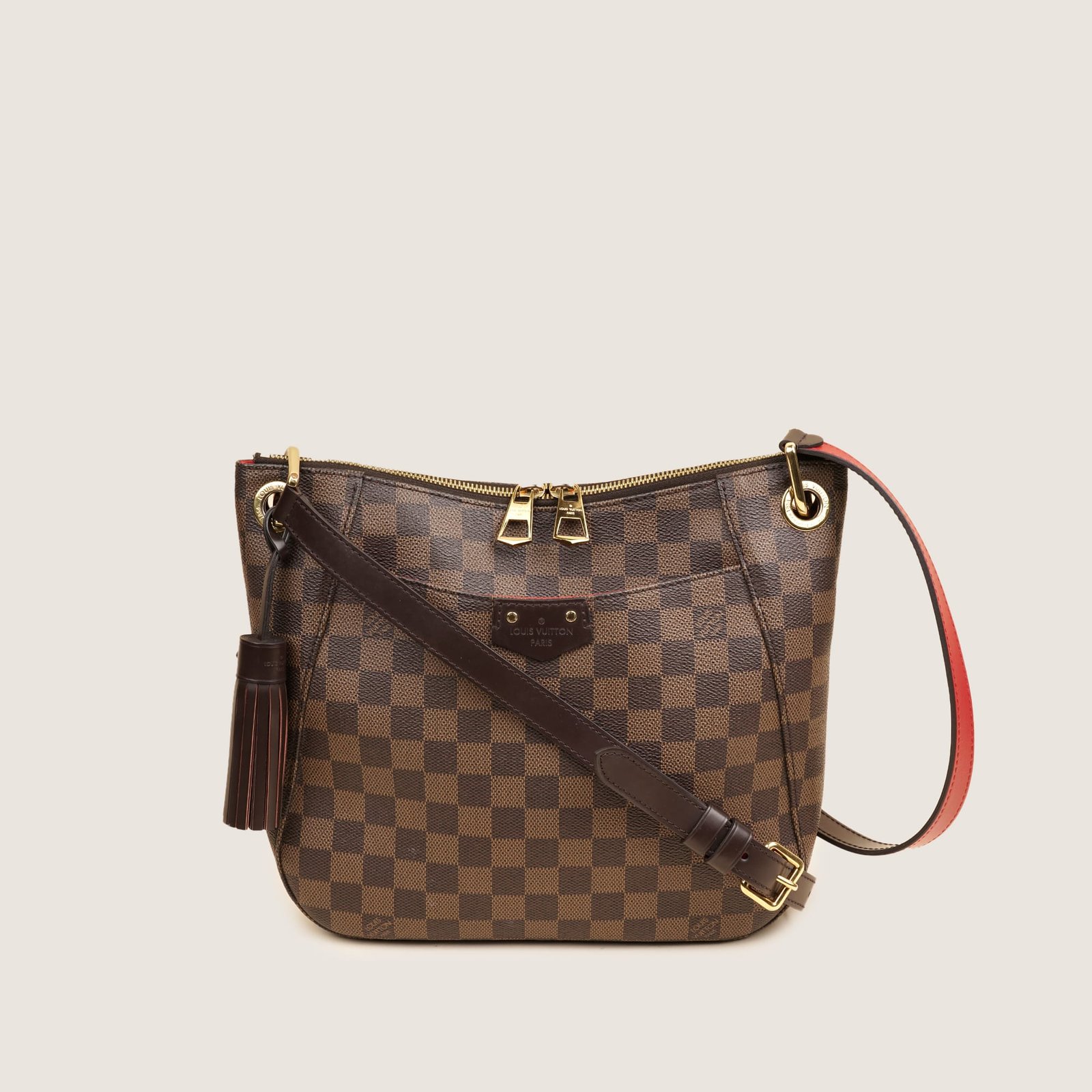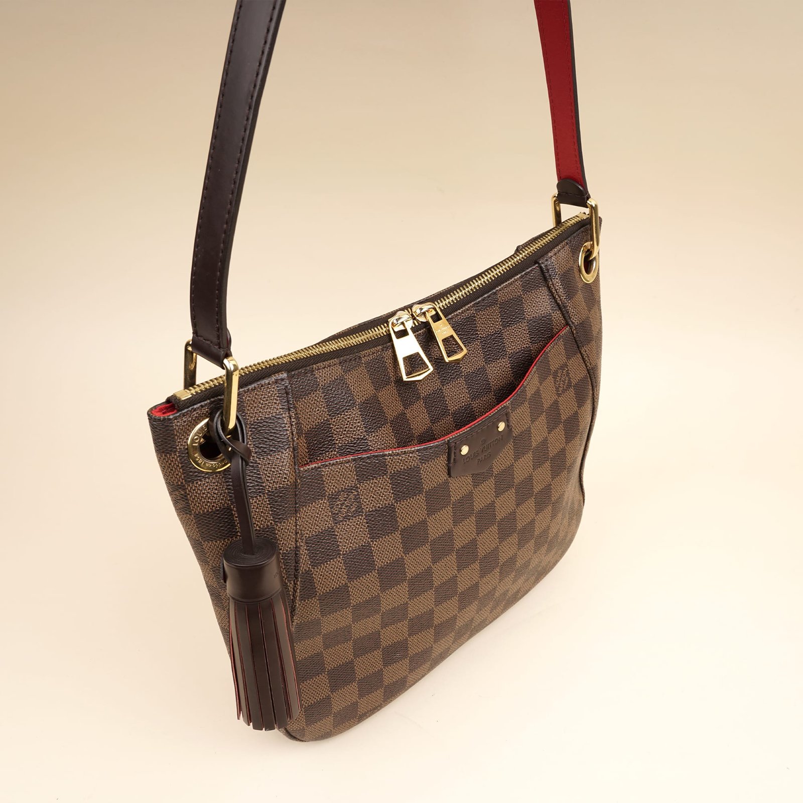 The Louis Vuitton South Bank Shoulder Bag is a timeless bag made from Damier Ebene Canvas, brown leather and matching brass hardware. The comfortable shoulder strap can easily be worn on the shoulder or the bend of the arm. It has easy access to a red lined interior with lots of room for your everyday essentials. The Louis Vuitton South Bank Shoulder Bag is the perfect everyday day bag. Don’t miss out!